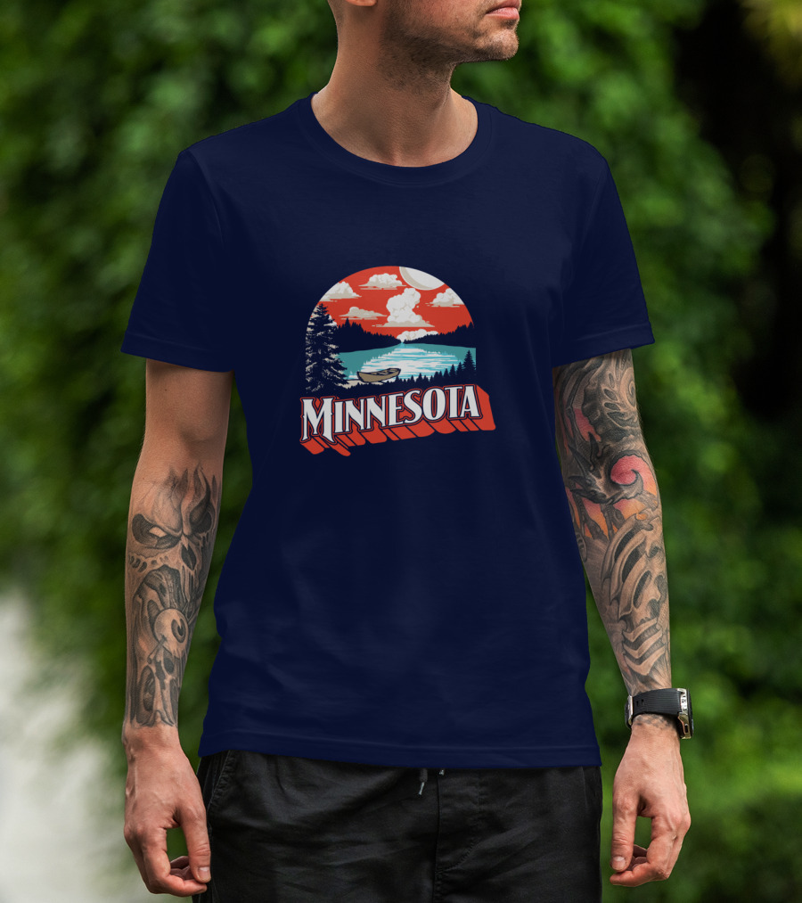 The Minnesota Boat on Scenic Vintage Lake with Forest and Sunset Sky T-shirt is designed for everyday wear and a consistent fit. Fabric is pre-shrunk ring-spun cotton with durable stitching. See the size chart below for exact measurements.