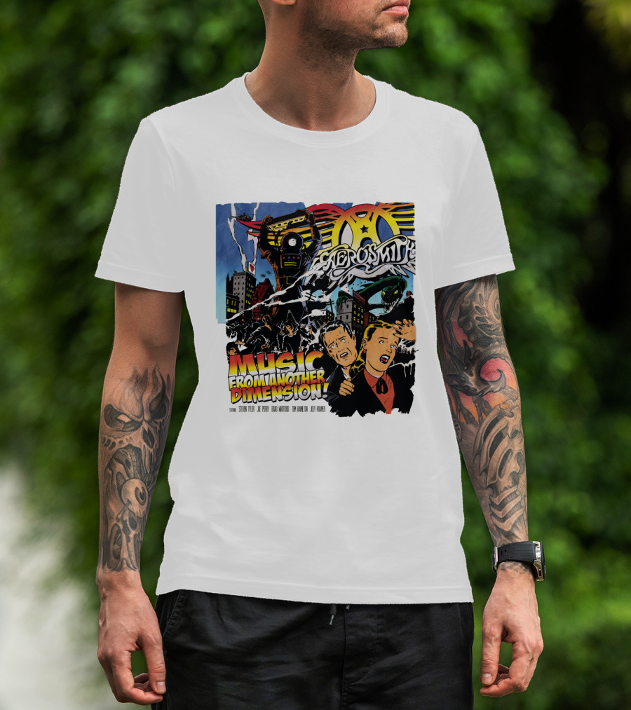 The Aerosmith Music From Another Dimension Comic-Style Galactic Robot Skyline T-shirt is designed for everyday wear and a consistent fit. Fabric is pre-shrunk ring-spun cotton with durable stitching. See the size chart below for exact measurements.