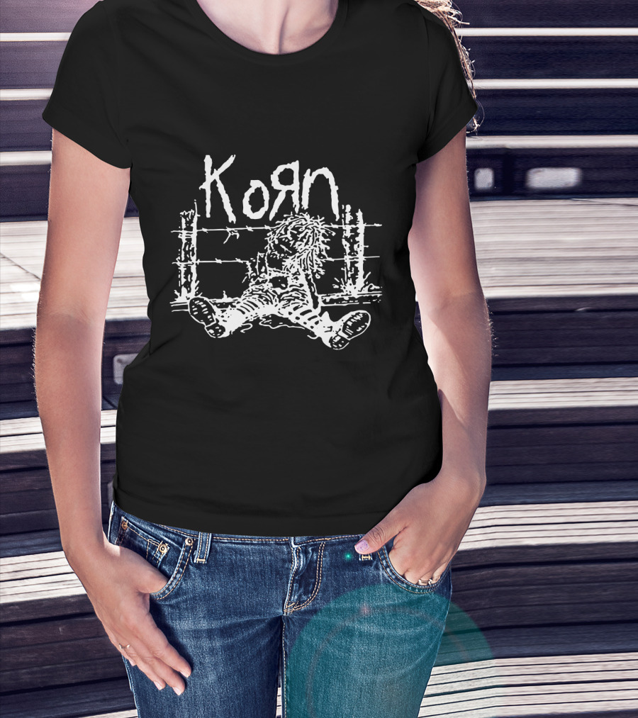 The Korn Grunge Style Sitting Figure with Barbed Wire Background T-shirt is designed for everyday wear and a consistent fit. Fabric is pre-shrunk ring-spun cotton with durable stitching. See the size chart below for exact measurements.