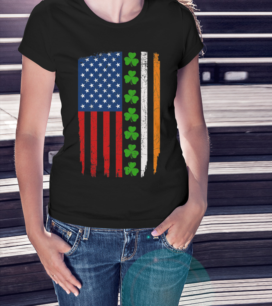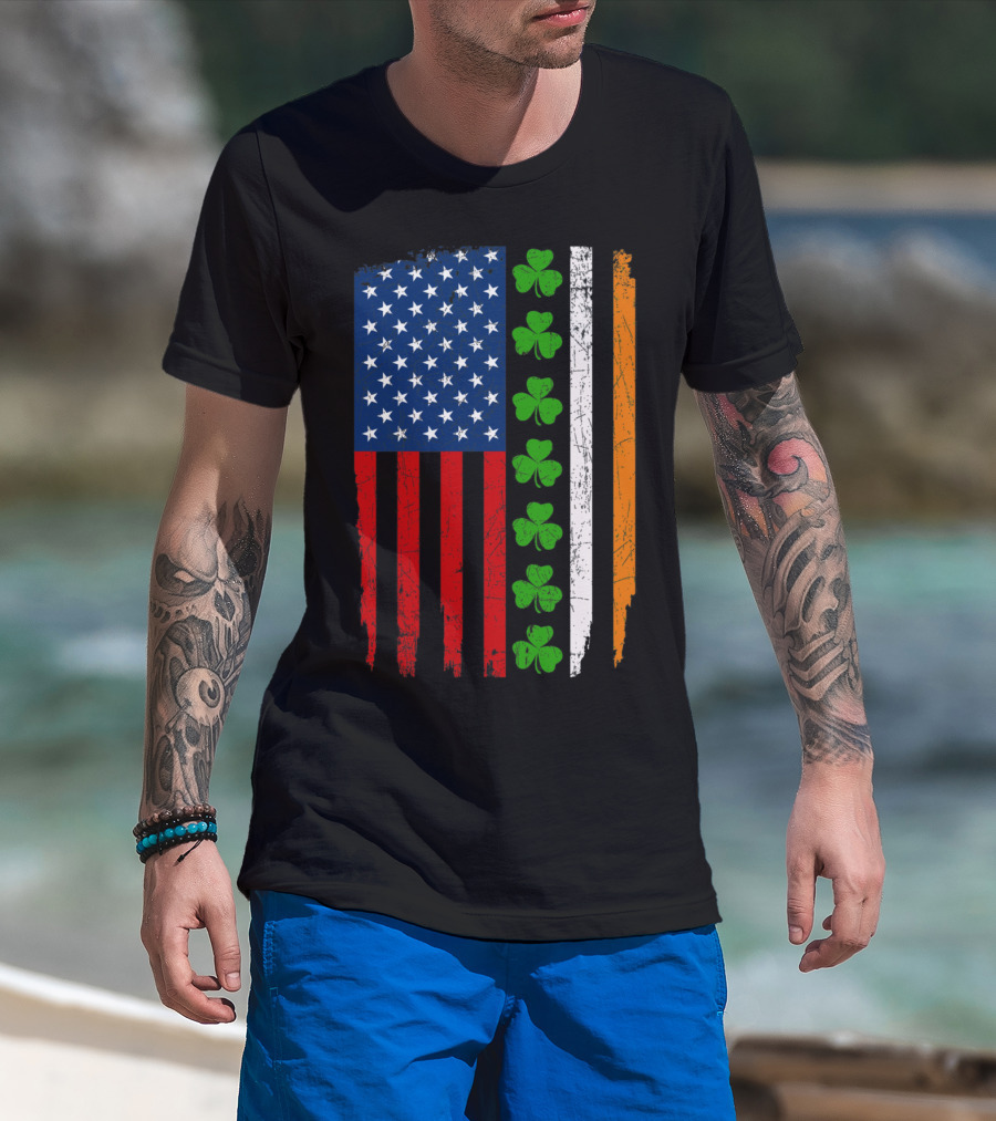 The American Irish Flag with Shamrocks T-shirt is designed for everyday wear and a consistent fit. Fabric is pre-shrunk ring-spun cotton with durable stitching. See the size chart below for exact measurements.