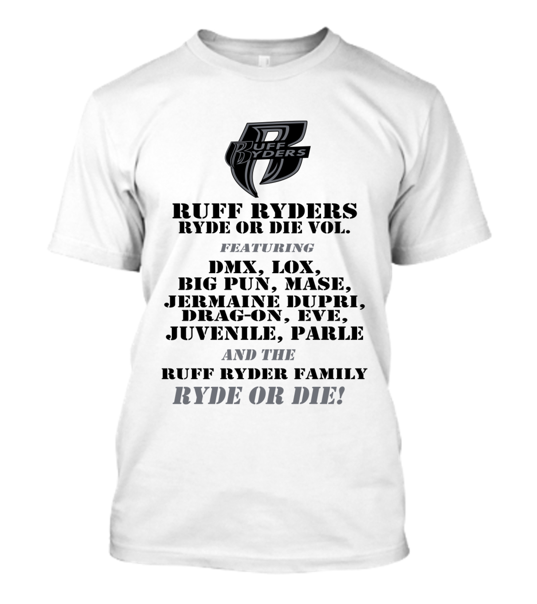 The Ruff Ryders Ryde or Die Vol Featuring DMX LOX Big Pun Mase Jermaine Dupri Drag-On Eve Juvenile Parle Ruff Ryder Family Ryde or Die T-shirt is designed for everyday wear and a consistent fit. Fabric is pre-shrunk ring-spun cotton with durable stitching. See the size chart below for exact measurements.