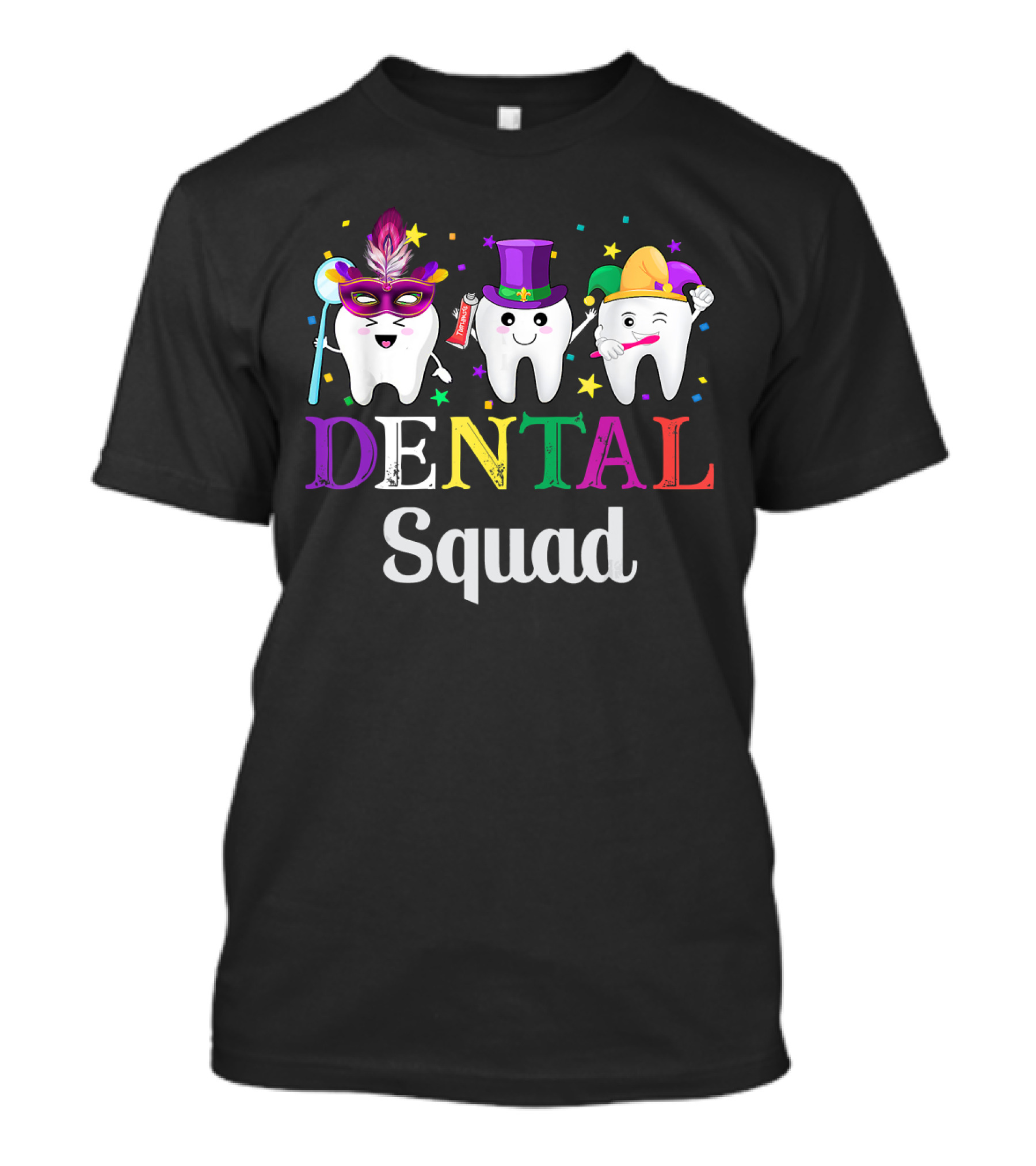 The Dental Squad Dental Assistant Tooth Mardi Gras T-shirt is designed for everyday wear and a consistent fit. Fabric is pre-shrunk ring-spun cotton with durable stitching. See the size chart below for exact measurements.
