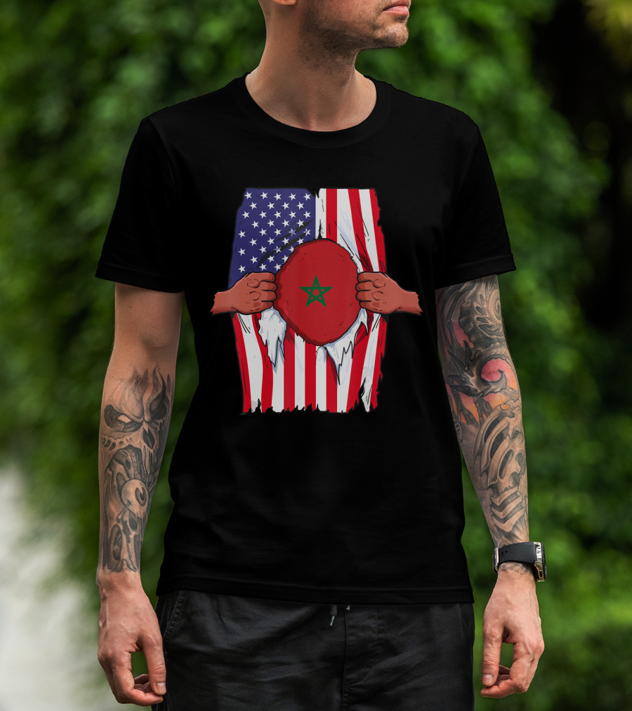 The Morocco Flag Inside American Flag Home Pride Moroccan T-shirt is designed for everyday wear and a consistent fit. Fabric is pre-shrunk ring-spun cotton with durable stitching. See the size chart below for exact measurements.