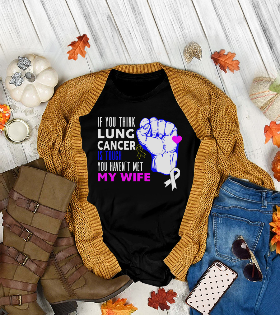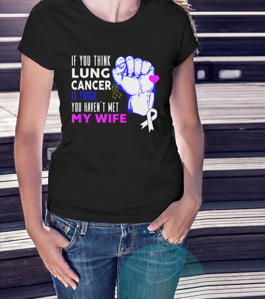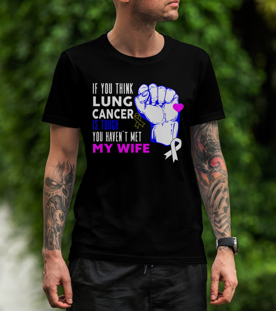 The If You Think Lung Cancer Is Tough You Haven't Met My Wife T-shirt is designed for everyday wear and a consistent fit. Fabric is pre-shrunk ring-spun cotton with durable stitching. See the size chart below for exact measurements.