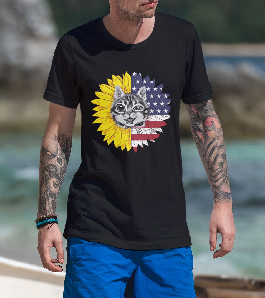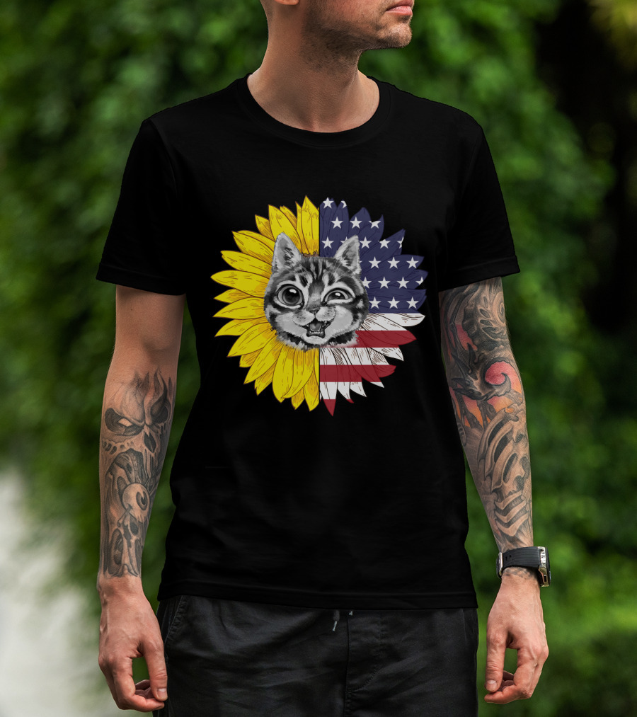 CAT LOVERS Sunflower American Flag Winking Cat T-Shirt
