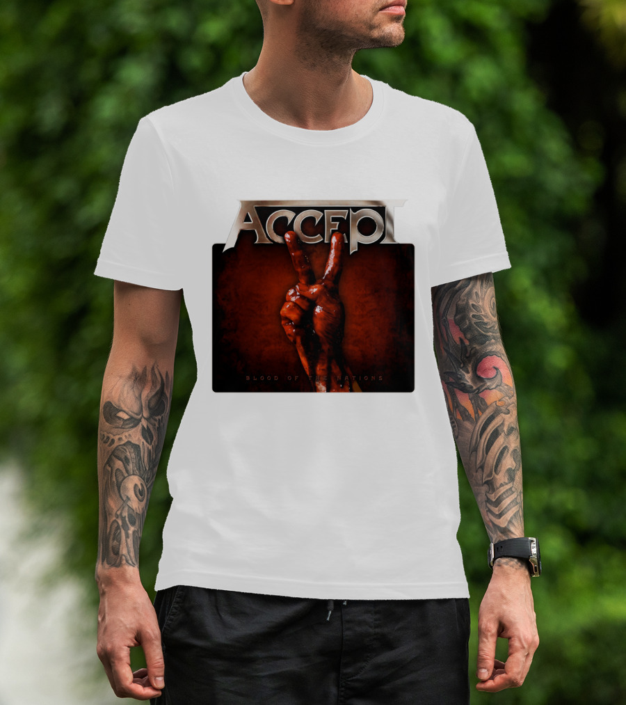The ACCEPT Blood Of The Nations Victory Hand Gesture T-shirt is designed for everyday wear and a consistent fit. Fabric is pre-shrunk ring-spun cotton with durable stitching. See the size chart below for exact measurements.
