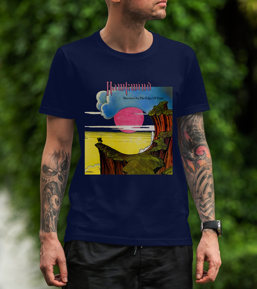 The Hawkwind Warrior On The Edge Of Time Cliff Sunset Scene T-shirt is designed for everyday wear and a consistent fit. Fabric is pre-shrunk ring-spun cotton with durable stitching. See the size chart below for exact measurements.