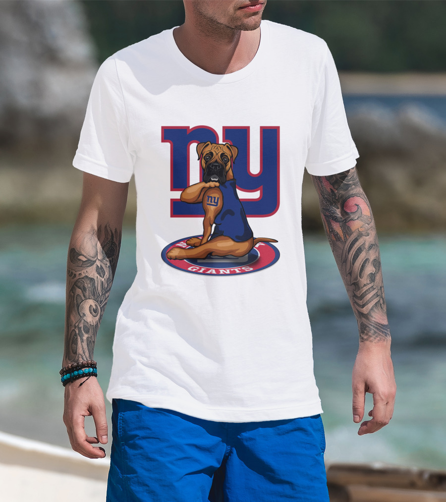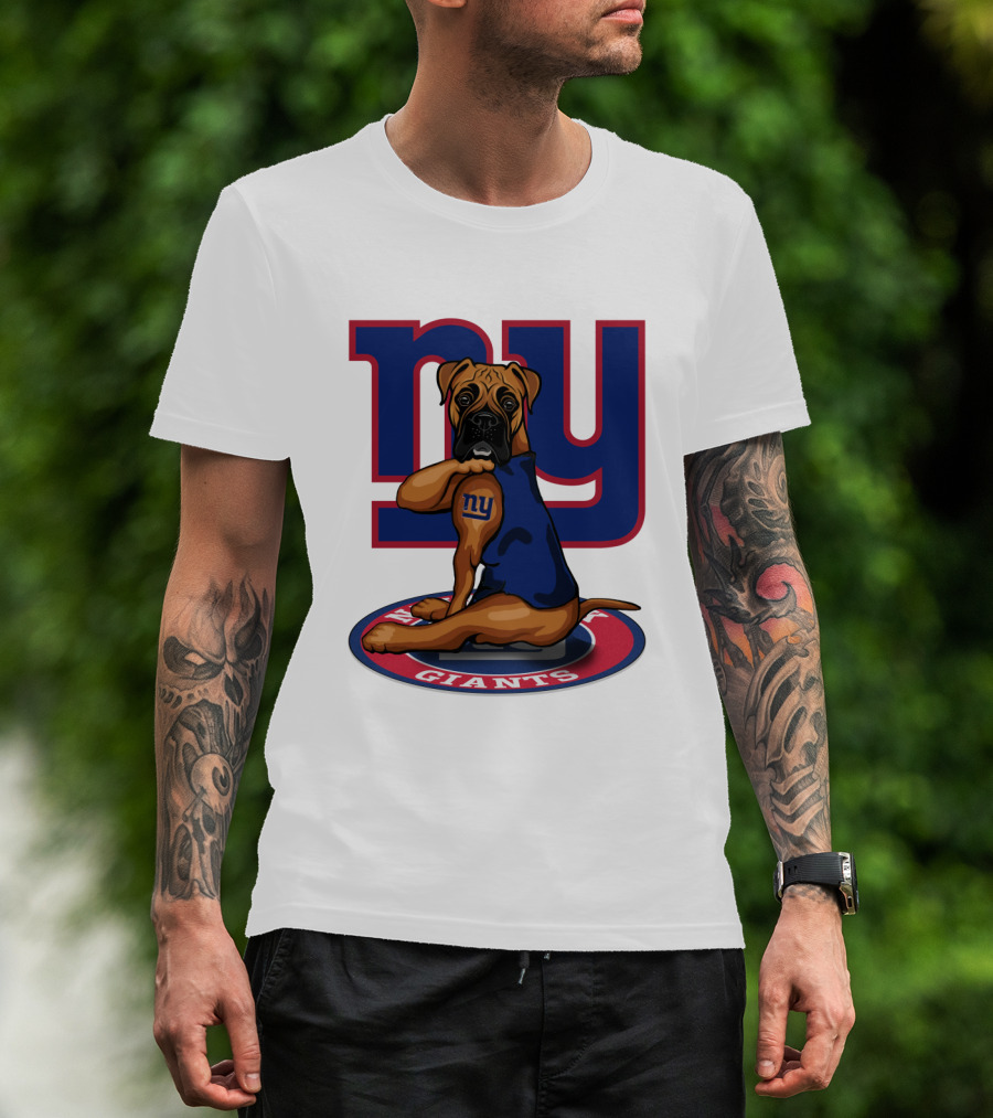 The NY Giants Boxer Dog T-shirt is designed for everyday wear and a consistent fit. Fabric is pre-shrunk ring-spun cotton with durable stitching. See the size chart below for exact measurements.