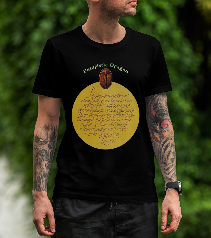 The Futuristic Dragon Ancient Steed Thunderbolt Monster Galactic Raver T-shirt is designed for everyday wear and a consistent fit. Fabric is pre-shrunk ring-spun cotton with durable stitching. See the size chart below for exact measurements.