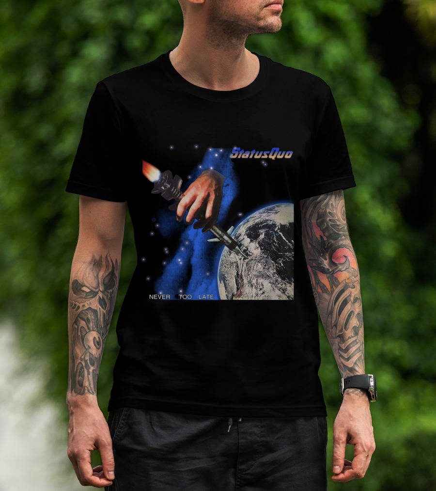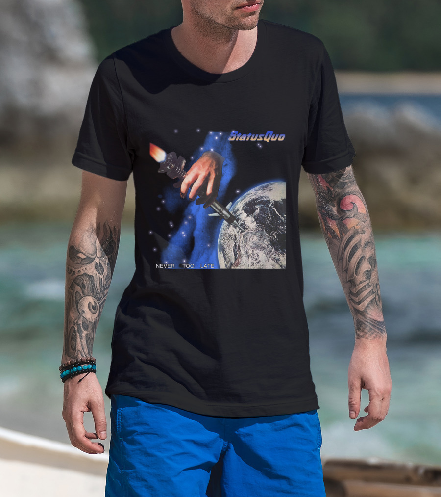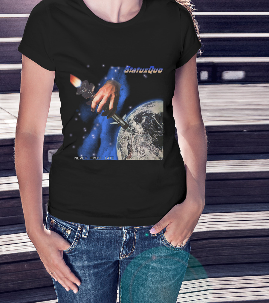 Status Quo Never Too Late Album Cover Space Hand Rocket Earth T-Shirt