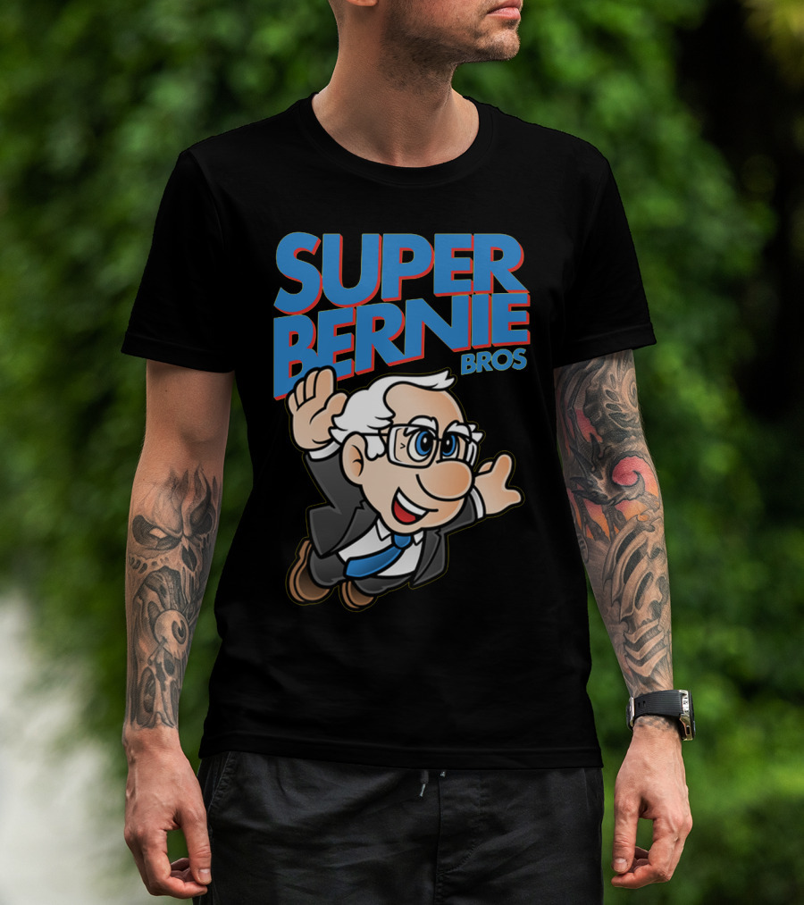 The Super Bernie Bros Flying Cartoon Character in Blue Suit and Glasses Iconic T-shirt is designed for everyday wear and a consistent fit. Fabric is pre-shrunk ring-spun cotton with durable stitching. See the size chart below for exact measurements.