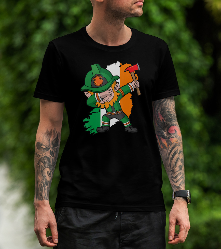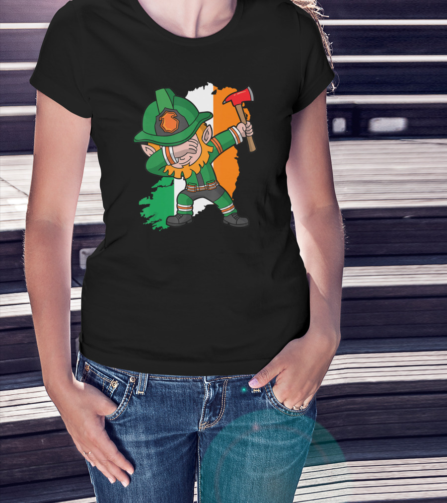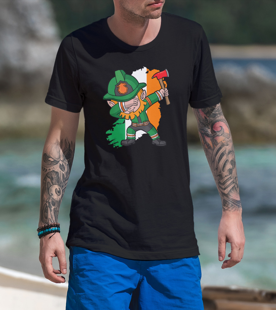 Leprechaun Dabbing Firefighter Irish Flag Background T-Shirt