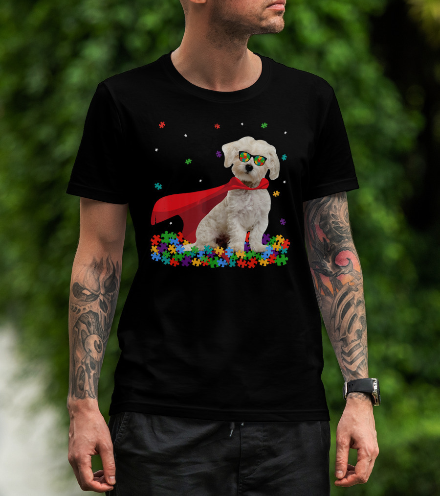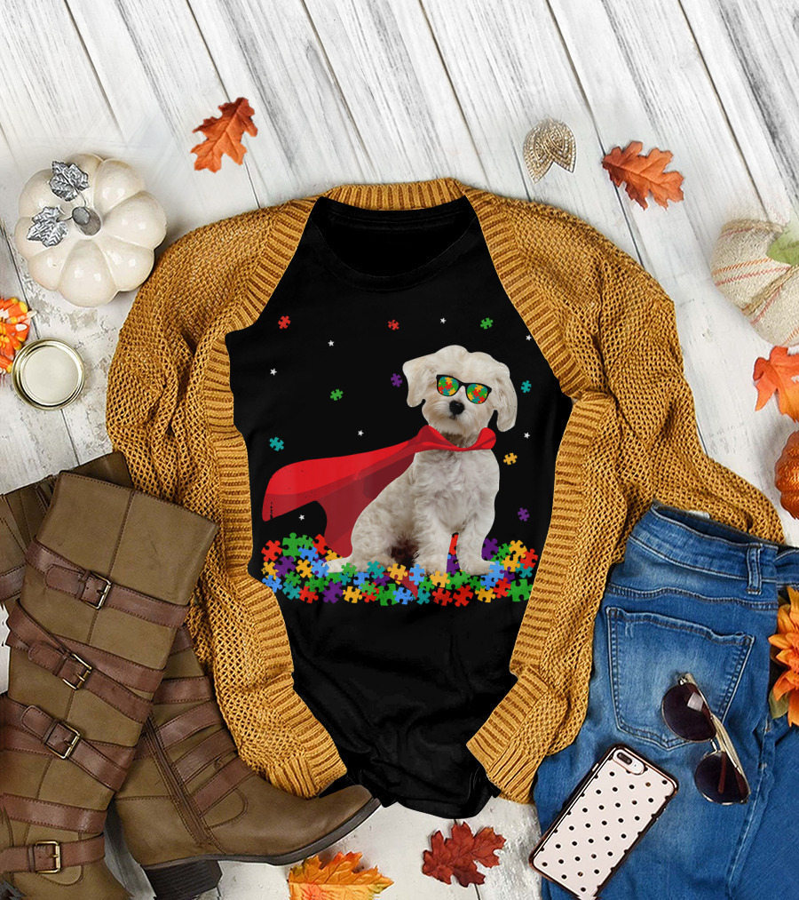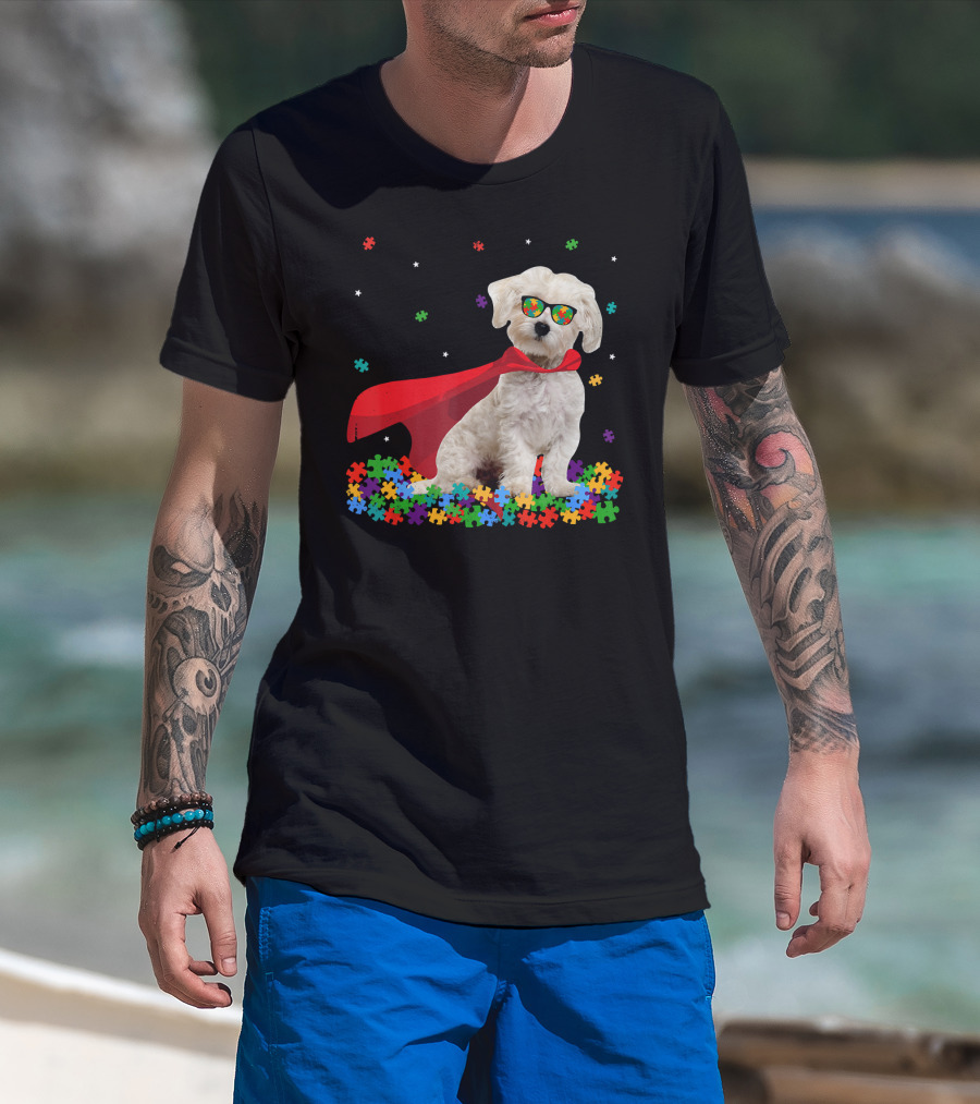 Superhero Maltese Dog Puzzle Pieces Autism Awareness T-Shirt