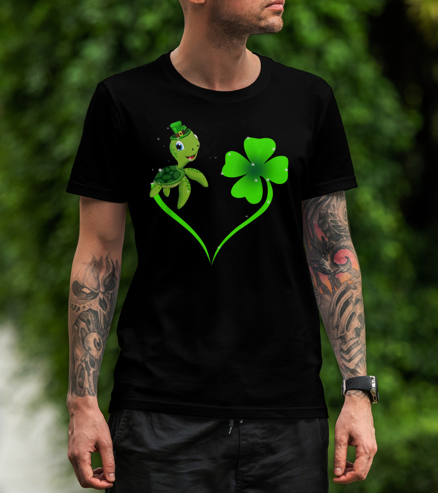 Happy St Patrick's Day Shamrock Turtle With Leprechaun Hat And Green Heart T-Shirt