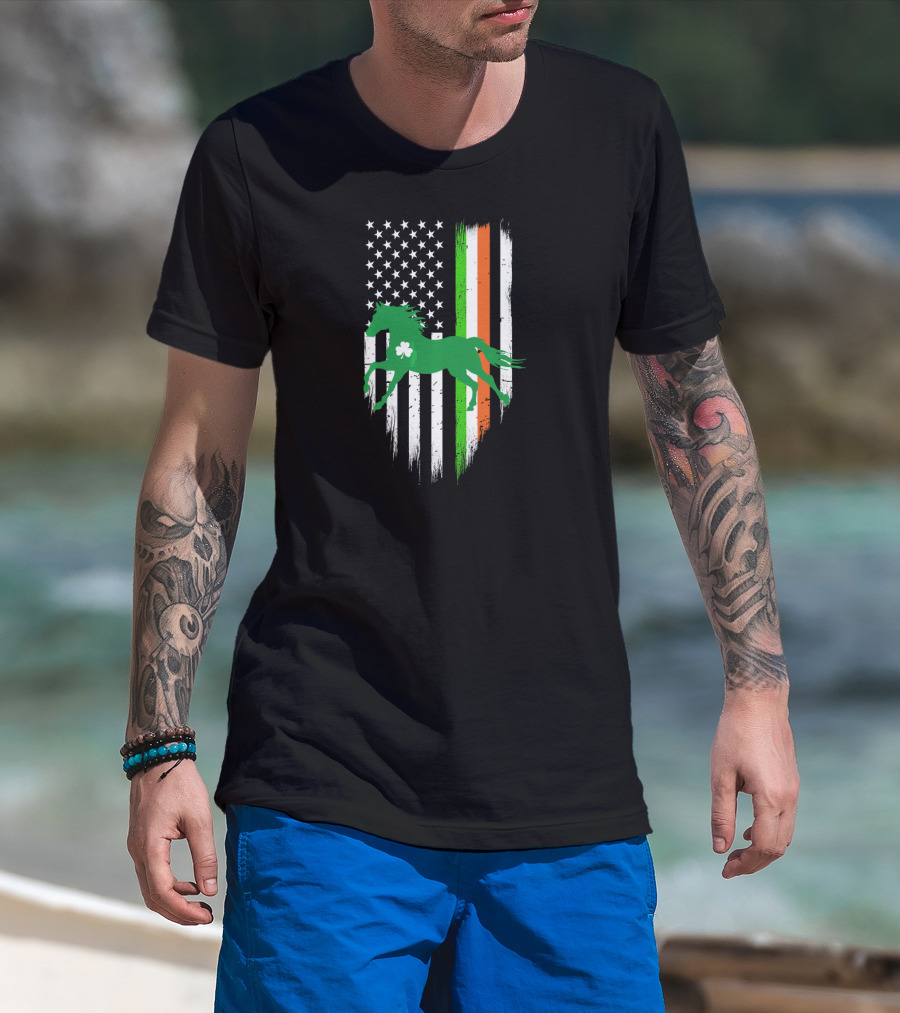 Green Horse Shamrock With Irish And US Flag St Patrick's Day T-Shirt