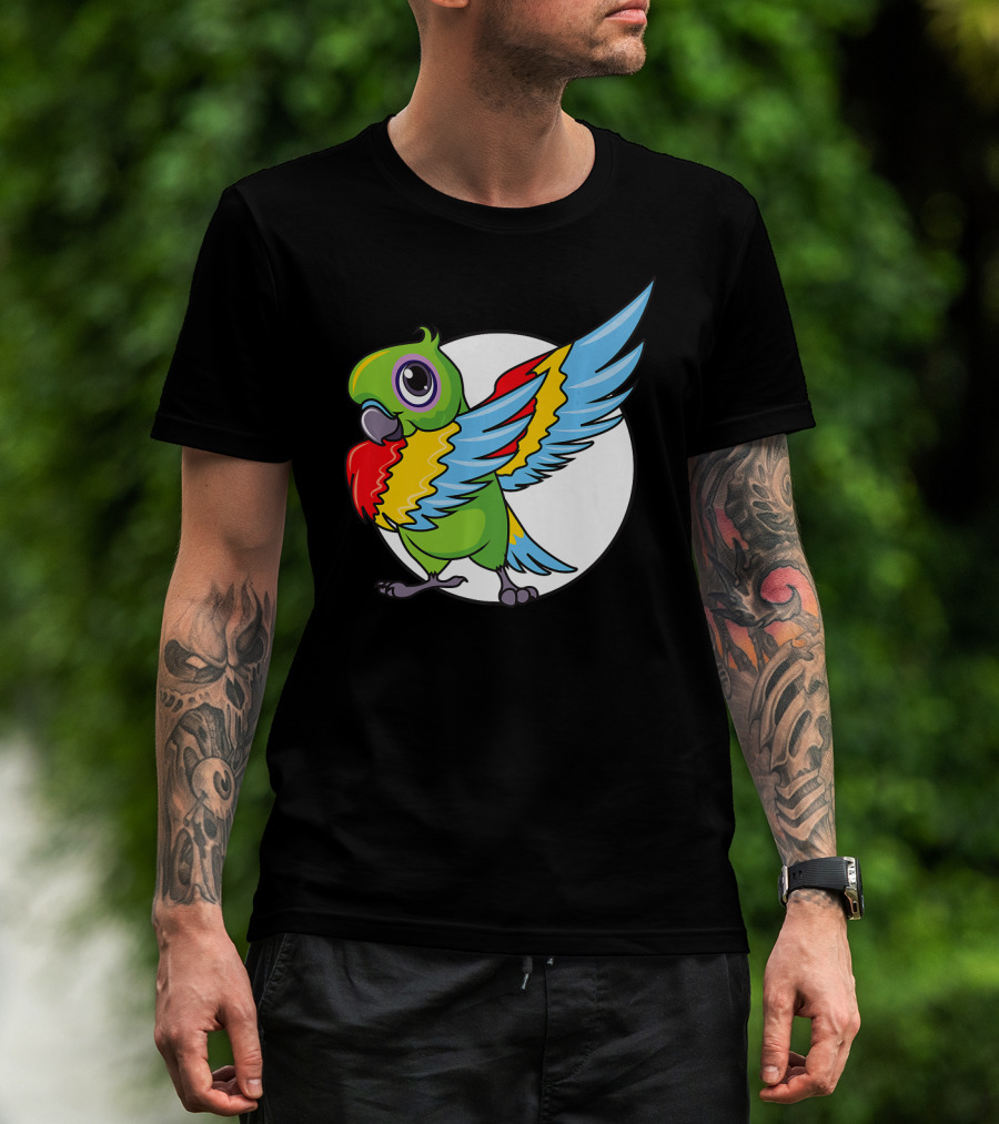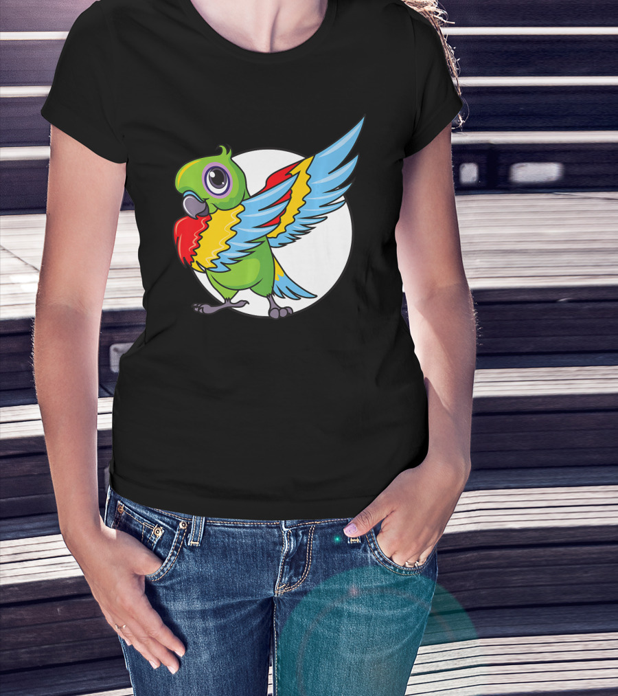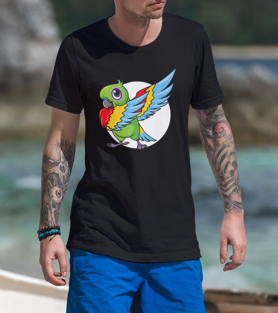 The Cute Dabbing Great Green Macaw Parrot Colorful Wings T-shirt is designed for everyday wear and a consistent fit. Fabric is pre-shrunk ring-spun cotton with durable stitching. See the size chart below for exact measurements.