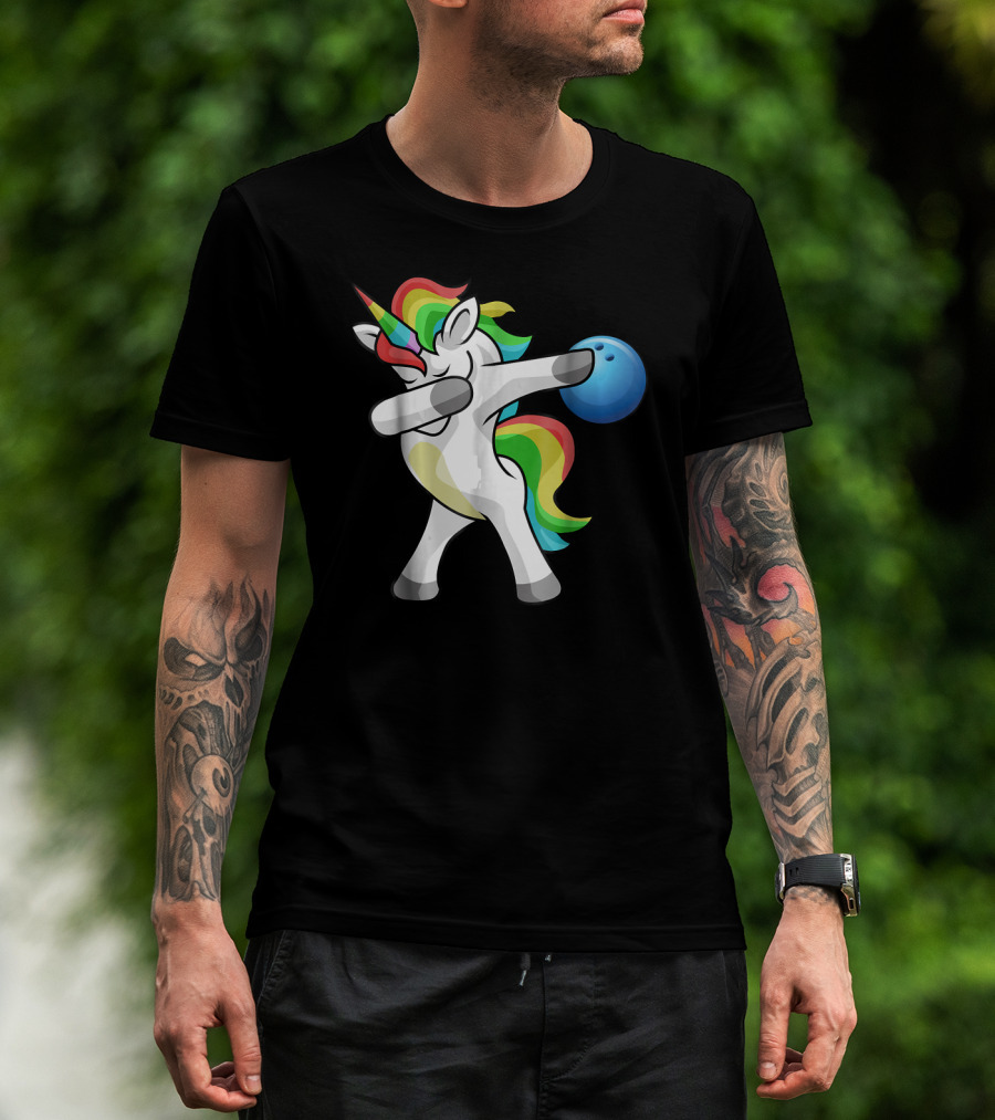 The Dabbing Unicorn Rainbow Bowling Funny Dab T-shirt is designed for everyday wear and a consistent fit. Fabric is pre-shrunk ring-spun cotton with durable stitching. See the size chart below for exact measurements.