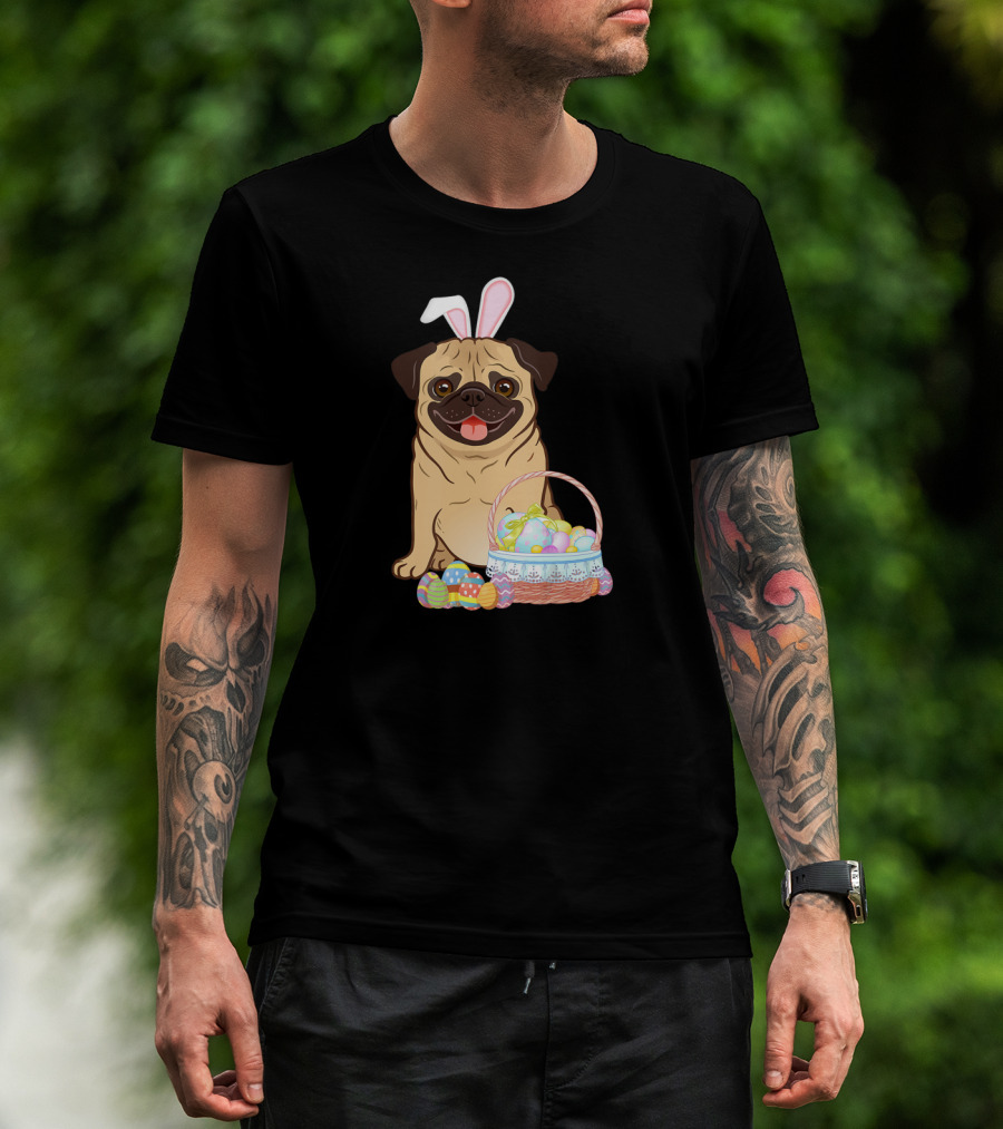 Pug Wearing Bunny Ears With Easter Egg Basket T-Shirt
