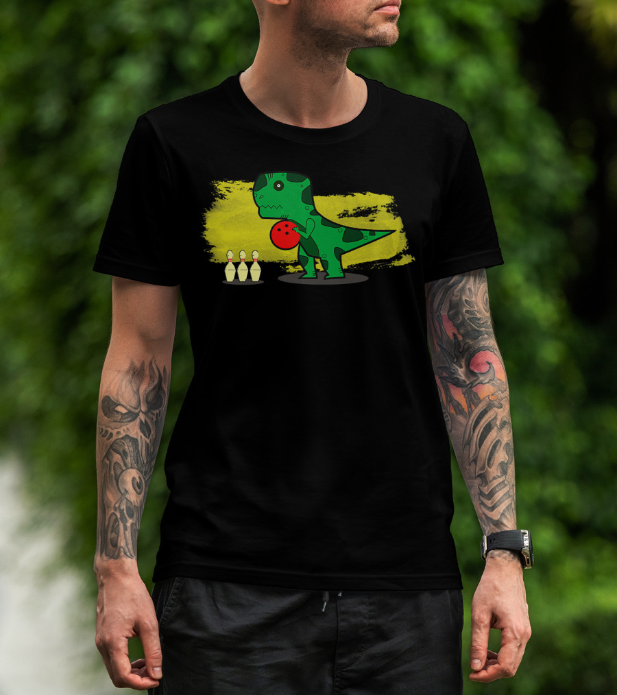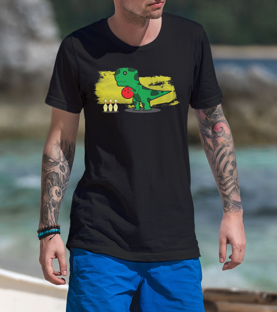 Dino Bowler With Red Bowling Ball And Pins In Yellow Splash Background T-Shirt