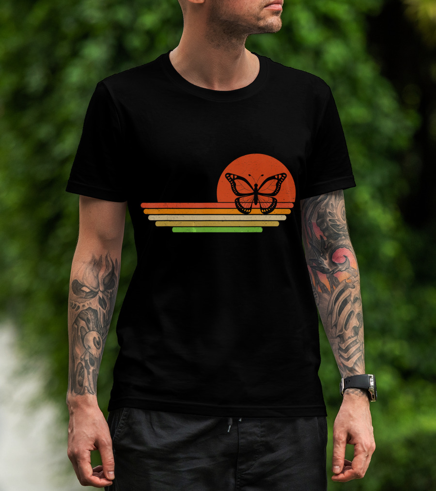 The Distressed Butterfly Retro Sunset Stripes T-shirt is designed for everyday wear and a consistent fit. Fabric is pre-shrunk ring-spun cotton with durable stitching. See the size chart below for exact measurements.
