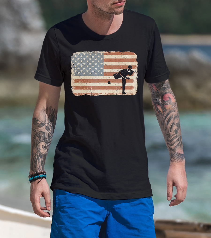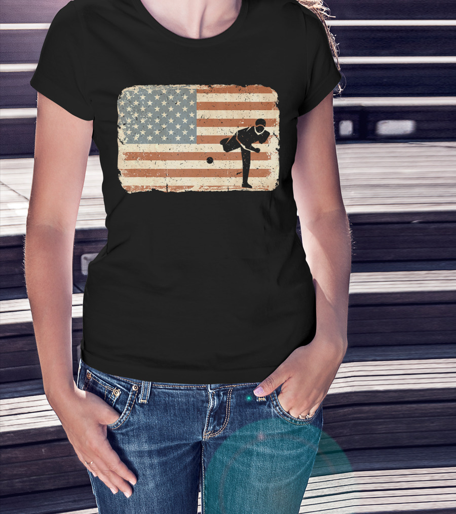 Vintage Baseball Pitcher Silhouette With American Flag Background T-Shirt