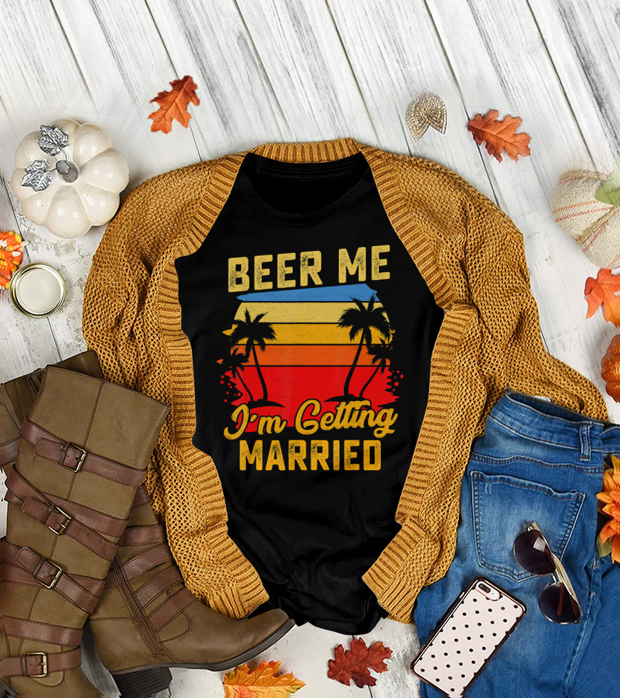 The Beer Me I'm Getting Married Sunset Palm Trees T-shirt is designed for everyday wear and a consistent fit. Fabric is pre-shrunk ring-spun cotton with durable stitching. See the size chart below for exact measurements.