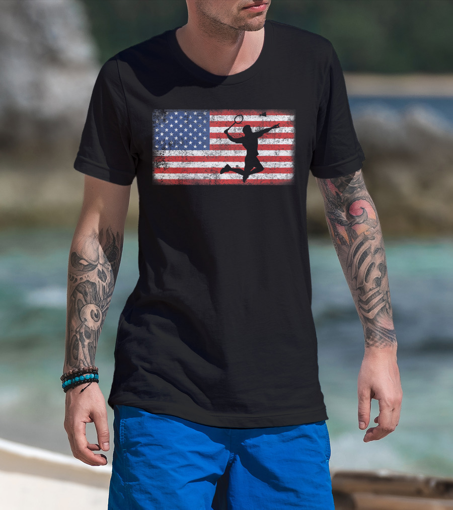 Vintage American Flag Badminton Player Silhouette Jumping Over T-Shirt