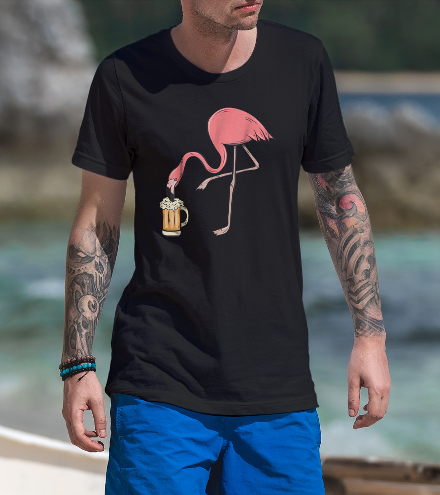 Funny Pink Flamingo Drinking Beer Illustrative Humor T-Shirt