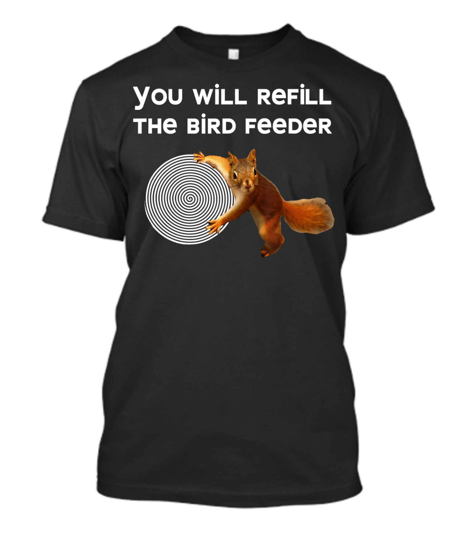 The You Will Refill the Bird Feeder Funny Bird Feeder is Empty Nutty Hyp Squirrel Hypnotizes T-shirt is designed for everyday wear and a consistent fit. Fabric is pre-shrunk ring-spun cotton with durable stitching. See the size chart below for exact measurements.