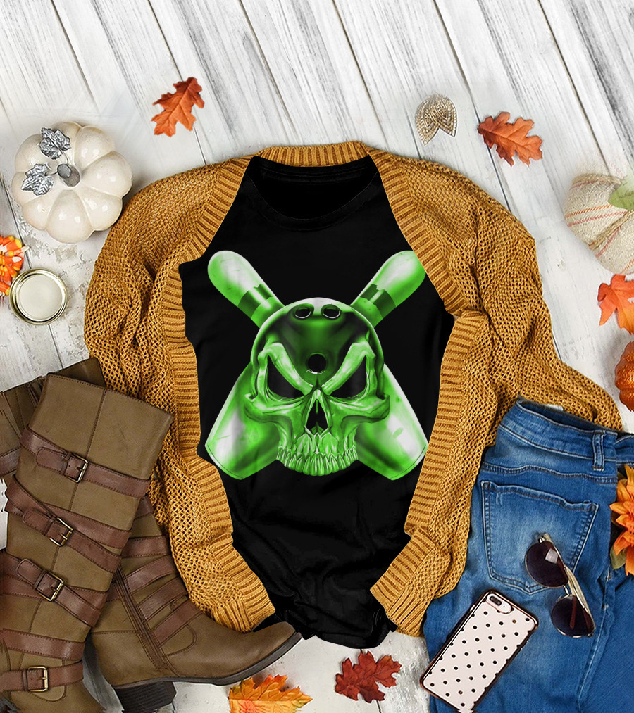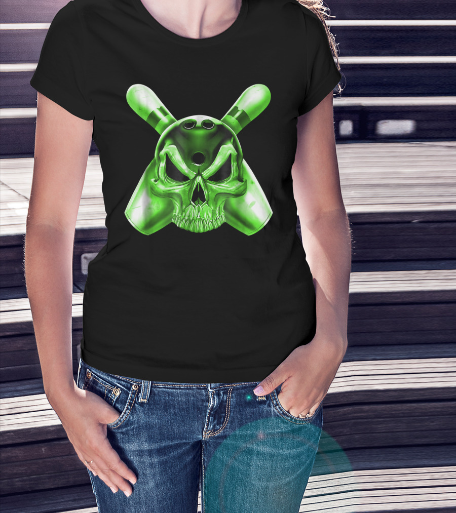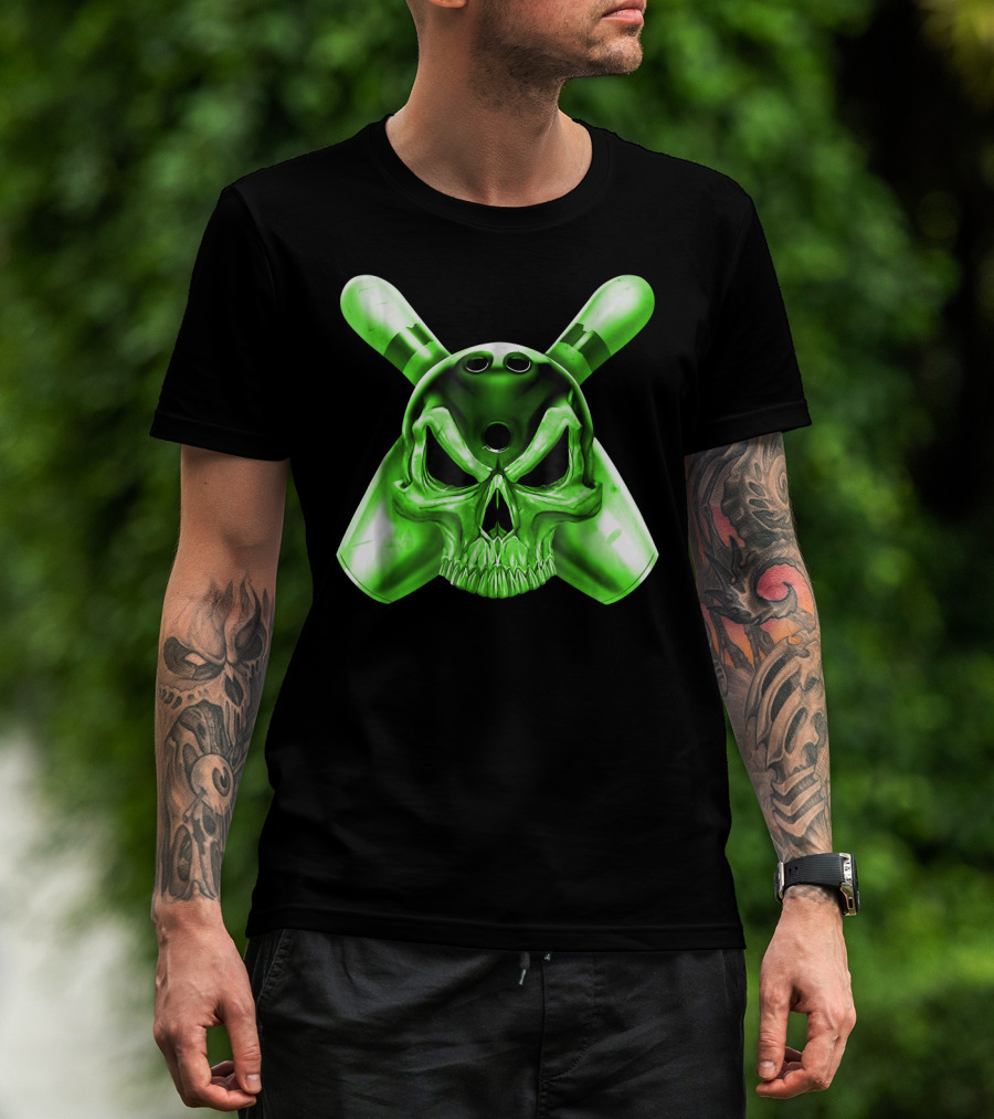 Bowling Skull Crossed Pins Green T-Shirt
