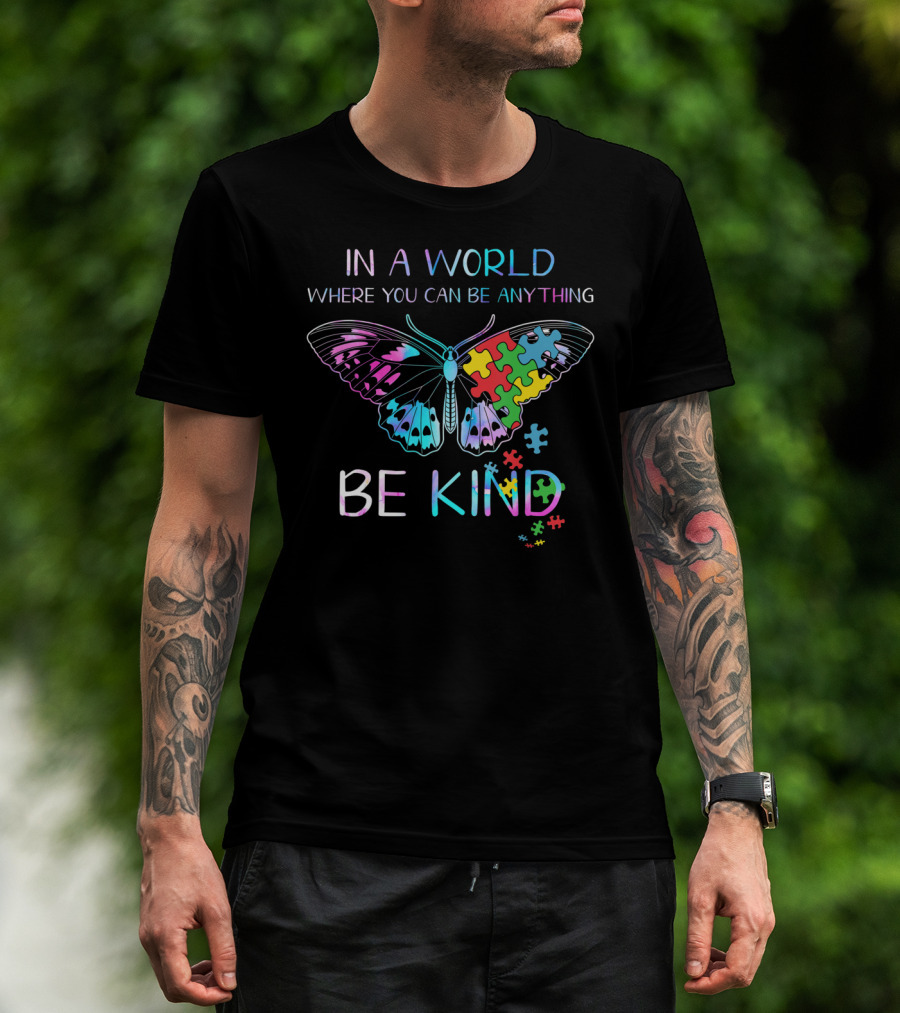 The In a World Where You Can Be Anything Be Kind Puzzle Butterfly T-shirt is designed for everyday wear and a consistent fit. Fabric is pre-shrunk ring-spun cotton with durable stitching. See the size chart below for exact measurements.