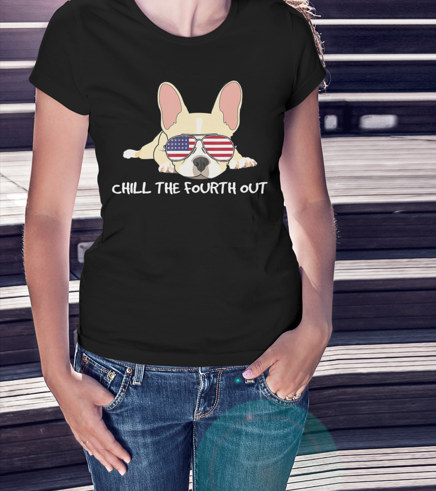 Chill The Fourth Out Funny Patriotic French Bulldog With American Flag Glasses T-Shirt