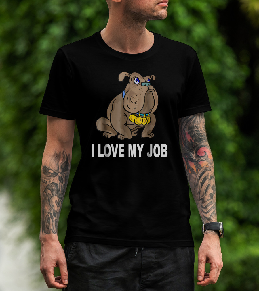 The I Love My Job Sarcastic Bulldog with Medals T-shirt is designed for everyday wear and a consistent fit. Fabric is pre-shrunk ring-spun cotton with durable stitching. See the size chart below for exact measurements.