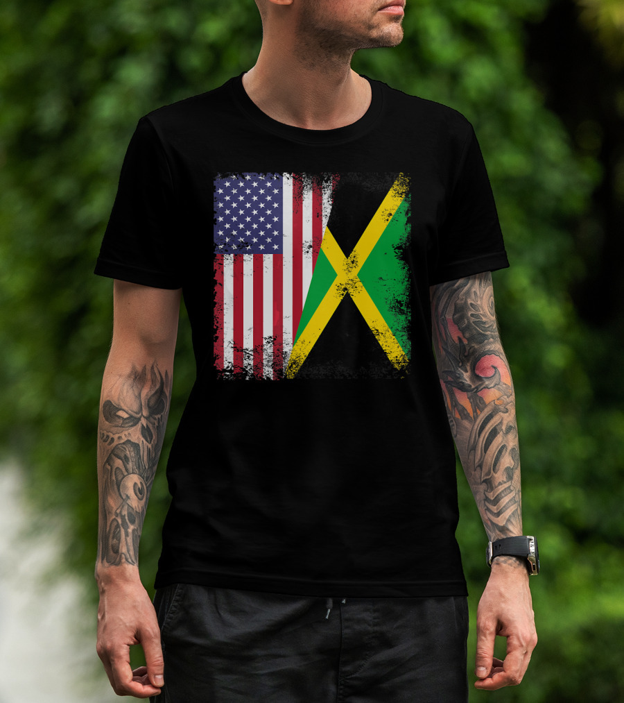 The Half Jamaican Flag Vintage Jamaica U.S.A. Flag Overlay T-shirt is designed for everyday wear and a consistent fit. Fabric is pre-shrunk ring-spun cotton with durable stitching. See the size chart below for exact measurements.