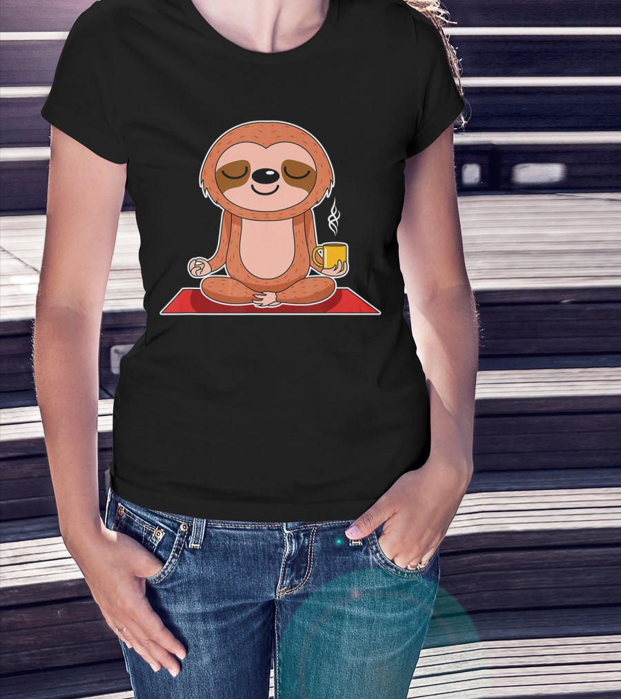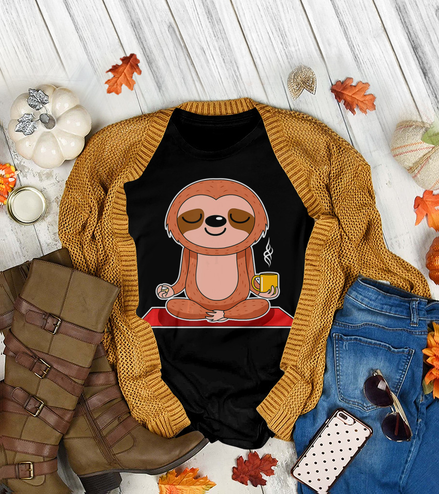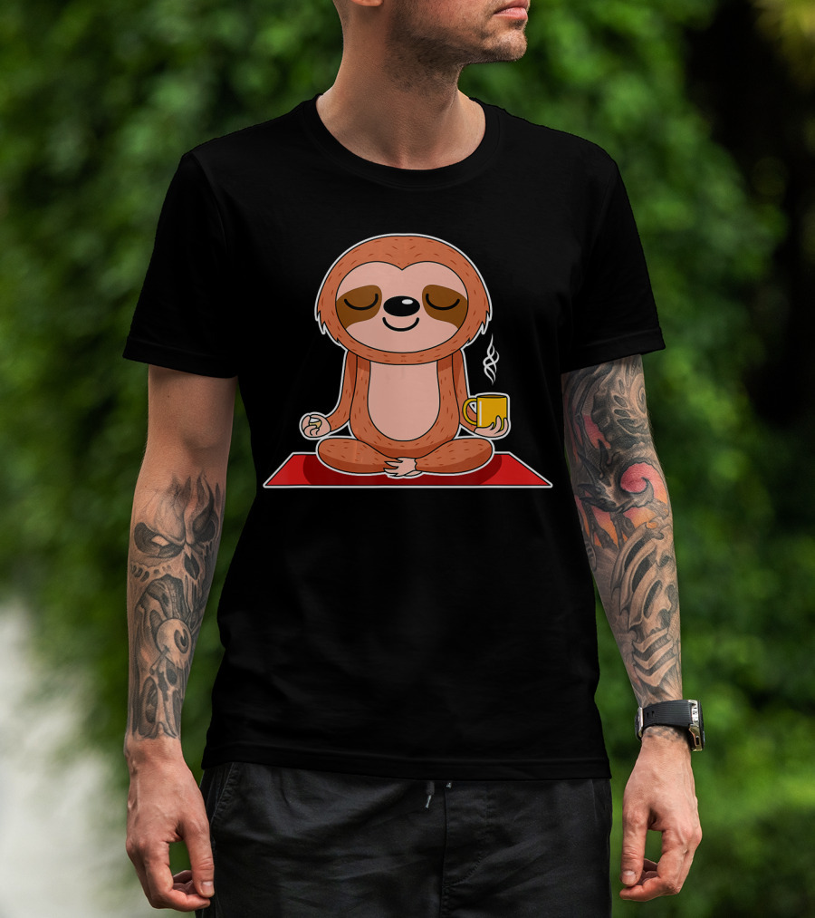 Yoga Sloth Funny Workout Fitness Casual Relaxing Meditation With Coffee T-Shirt