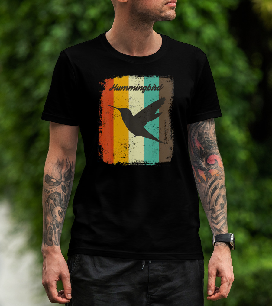 The 70s Vintage Hummingbird Silhouette Retro Stripes T-shirt is designed for everyday wear and a consistent fit. Fabric is pre-shrunk ring-spun cotton with durable stitching. See the size chart below for exact measurements.