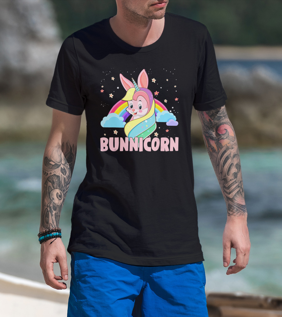 The Bunnicorn Rainbow Unicorn Easter Clouds Stars T-shirt is designed for everyday wear and a consistent fit. Fabric is pre-shrunk ring-spun cotton with durable stitching. See the size chart below for exact measurements.