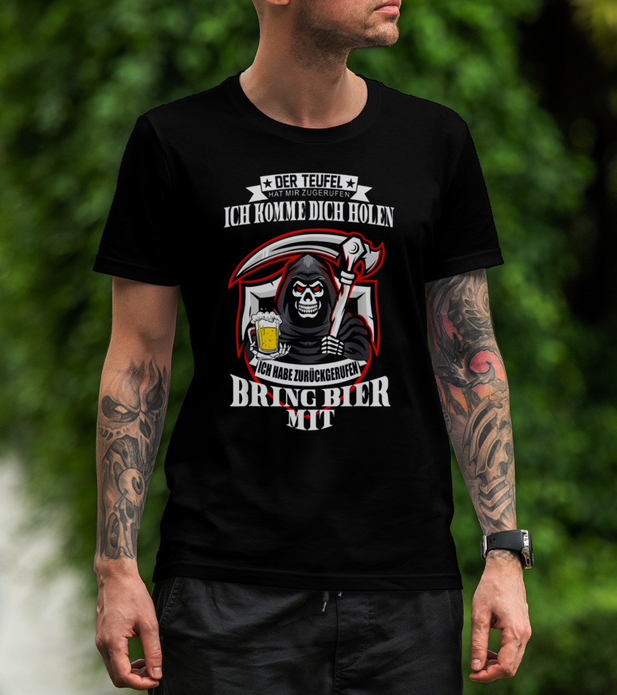 The Der Teufel Hat Mir Zugerufen Ich Komme Dich Holen Ich Habe Zurückgerufen Bring Bier Mit T-shirt is designed for everyday wear and a consistent fit. Fabric is pre-shrunk ring-spun cotton with durable stitching. See the size chart below for exact measurements.