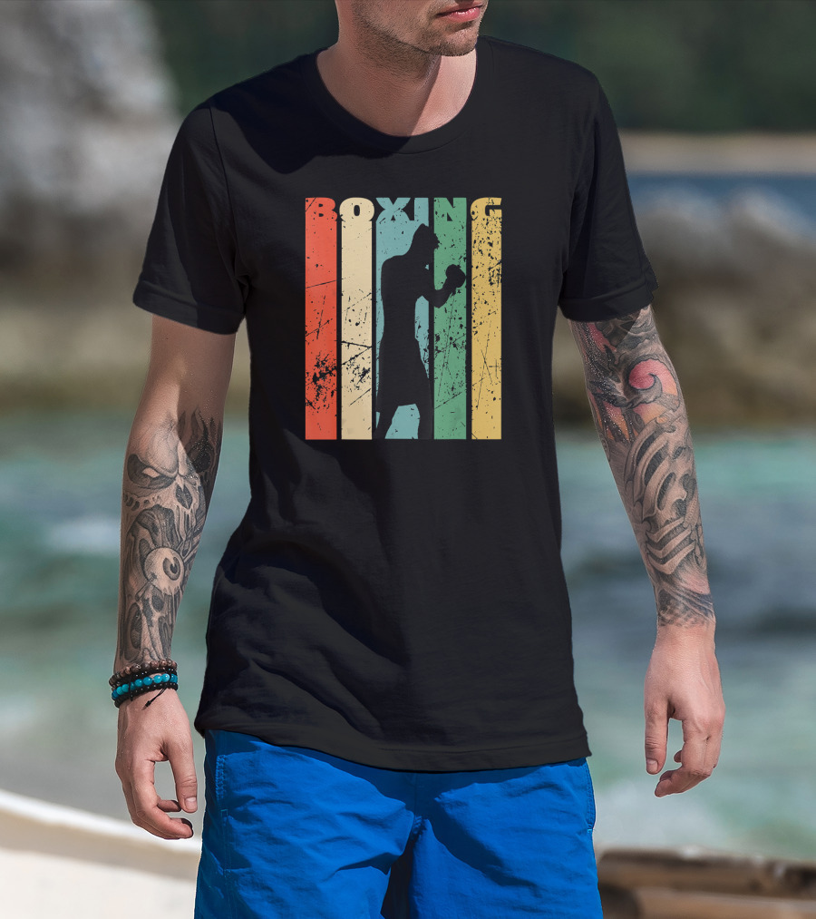 The Boxing Vintage Distressed Silhouette Retro Stripes T-shirt is designed for everyday wear and a consistent fit. Fabric is pre-shrunk ring-spun cotton with durable stitching. See the size chart below for exact measurements.