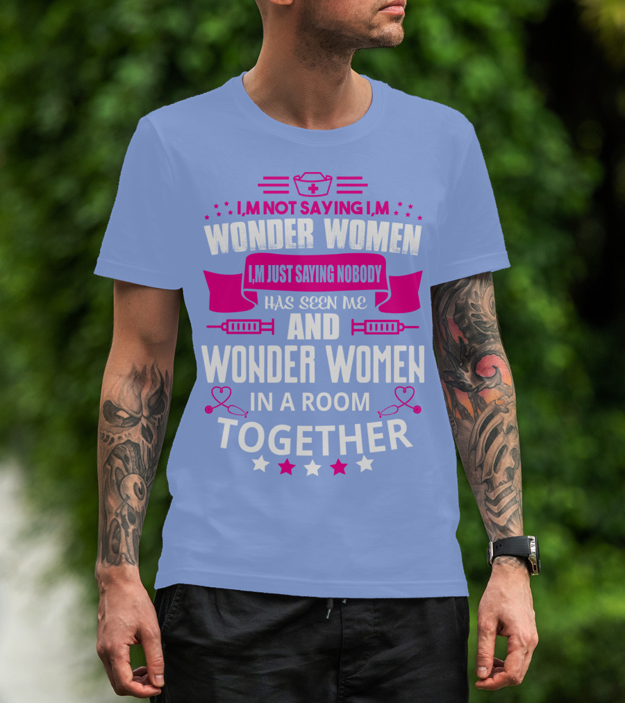 The I'm Not Saying I'm Wonder Women I'm Just Saying Nobody Has Seen Me and Wonder Women in a Room Together T-shirt is designed for everyday wear and a consistent fit. Fabric is pre-shrunk ring-spun cotton with durable stitching. See the size chart below for exact measurements.