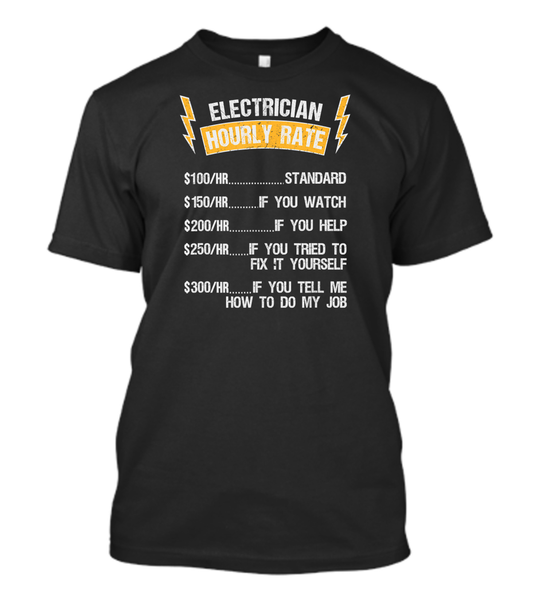 The Electrician Hourly Rate Standard Watch Help Fix Yourself Tell Me How to Do My Job T-shirt is designed for everyday wear and a consistent fit. Fabric is pre-shrunk ring-spun cotton with durable stitching. See the size chart below for exact measurements.