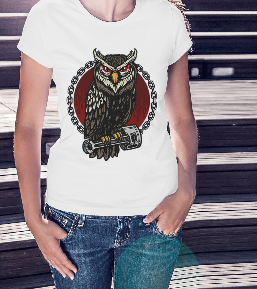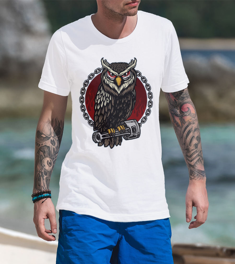 Owl And Piston Motorbike Enthusiast Chain Flame Background T-Shirt