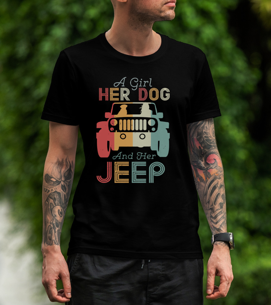 The A Girl Her Dog and Her Jeep T-shirt is designed for everyday wear and a consistent fit. Fabric is pre-shrunk ring-spun cotton with durable stitching. See the size chart below for exact measurements.