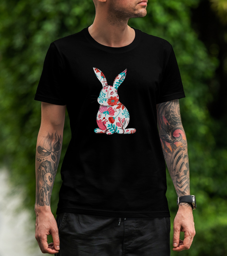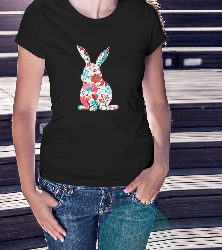 The Easter Bunny with Colorful Floral Pattern for Women T-shirt is designed for everyday wear and a consistent fit. Fabric is pre-shrunk ring-spun cotton with durable stitching. See the size chart below for exact measurements.