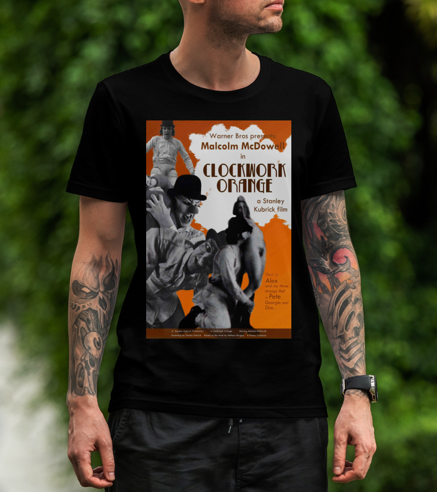 The Warner Bros Presents Malcolm McDowell in A Clockwork Orange a Stanley Kubrick Film T-shirt is designed for everyday wear and a consistent fit. Fabric is pre-shrunk ring-spun cotton with durable stitching. See the size chart below for exact measurements.