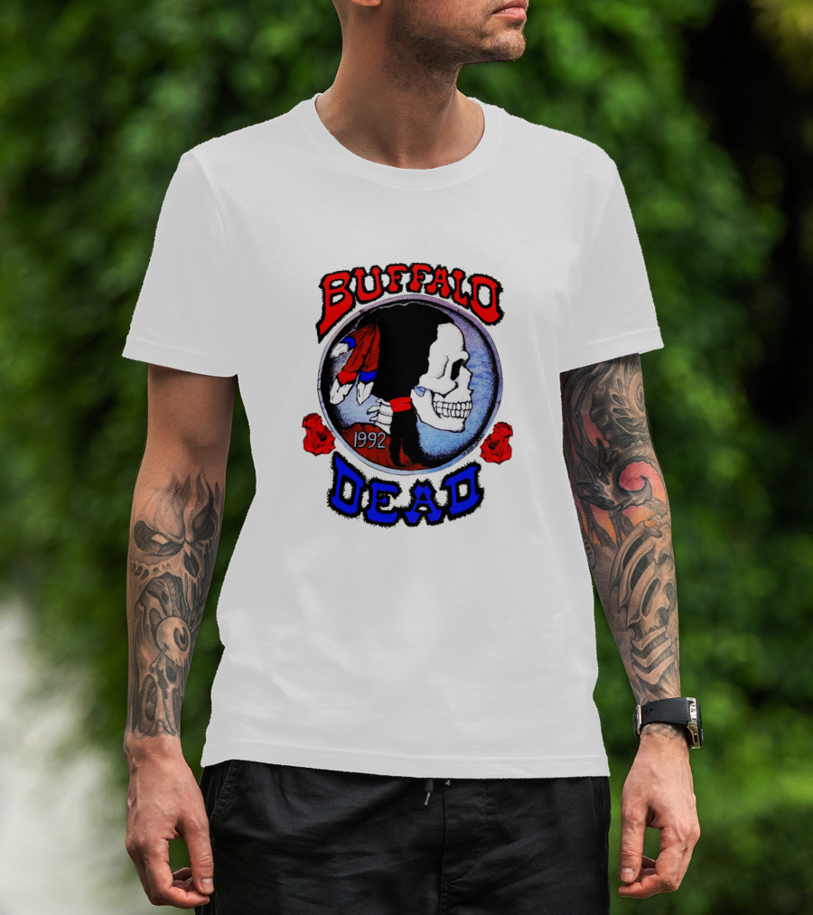 The Buffalo Dead 1992 Skull with Roses T-shirt is designed for everyday wear and a consistent fit. Fabric is pre-shrunk ring-spun cotton with durable stitching. See the size chart below for exact measurements.