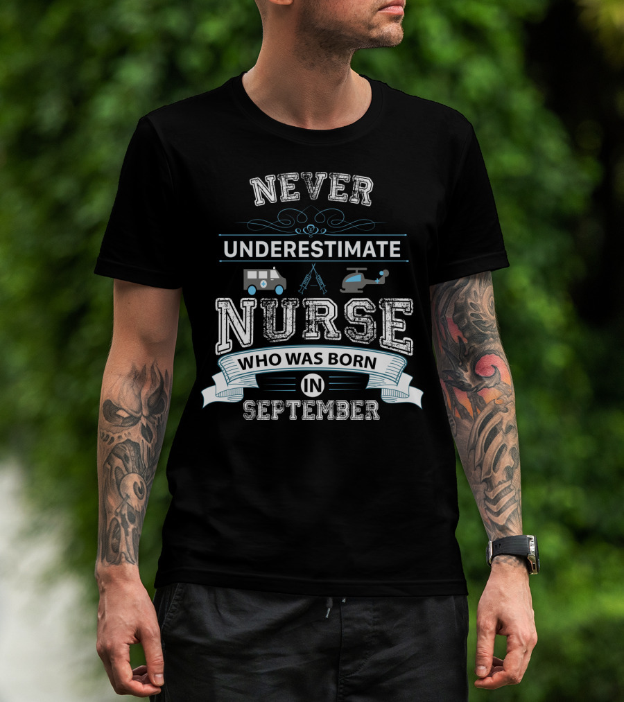 How much will this Never Underestimate a Nurse Born in September with Ambulance Helicopter and Syringe Icons shirt shrink?