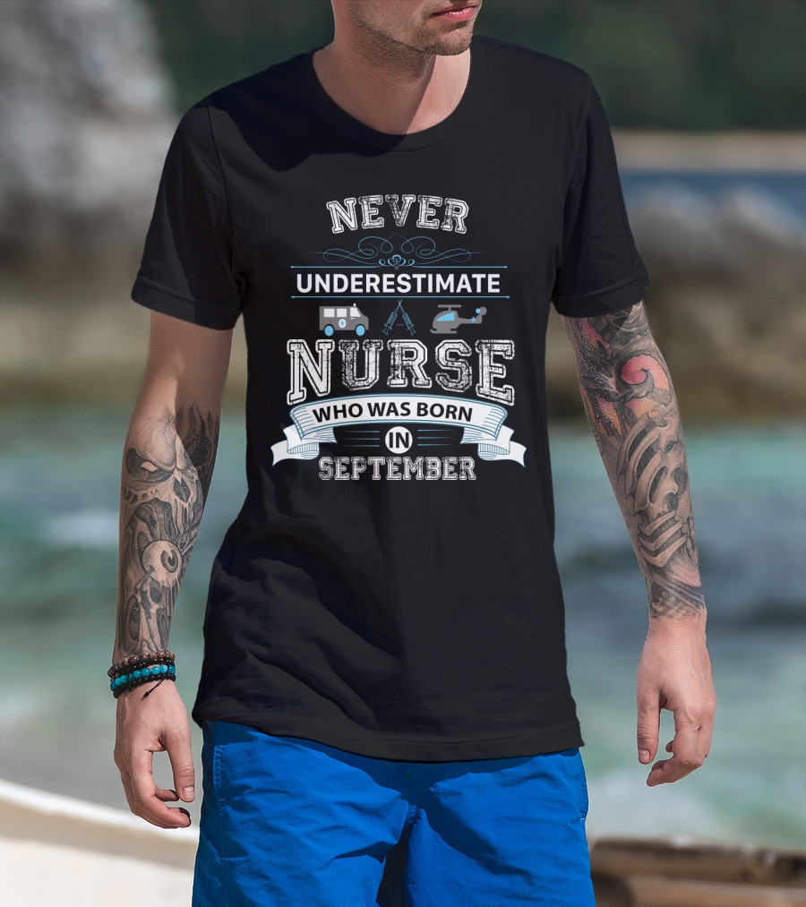 Never Underestimate A Nurse Born In September With Ambulance Helicopter And Syringe Icons T-Shirt