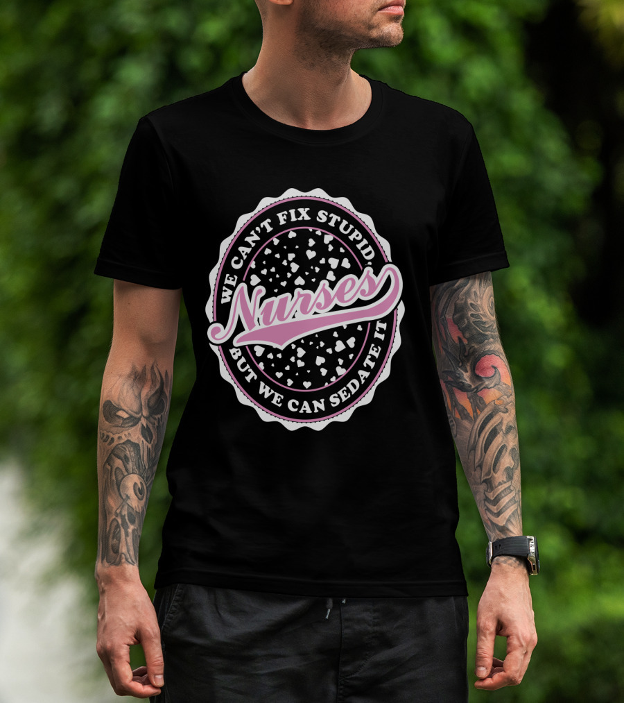 The We Can't Fix Stupid Nurses But We Can Sedate It T-shirt is designed for everyday wear and a consistent fit. Fabric is pre-shrunk ring-spun cotton with durable stitching. See the size chart below for exact measurements.