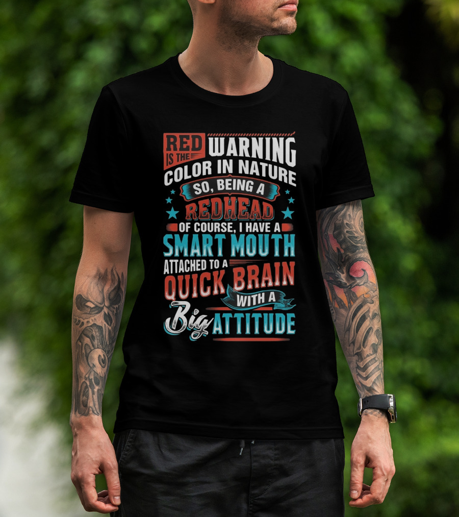 The Red Is The Warning Color In Nature So Being A Redhead Of Course I Have A Smart Mouth Attached To A Quick Brain With A Big Attitude T-shirt is designed for everyday wear and a consistent fit. Fabric is pre-shrunk ring-spun cotton with durable stitching. See the size chart below for exact measurements.